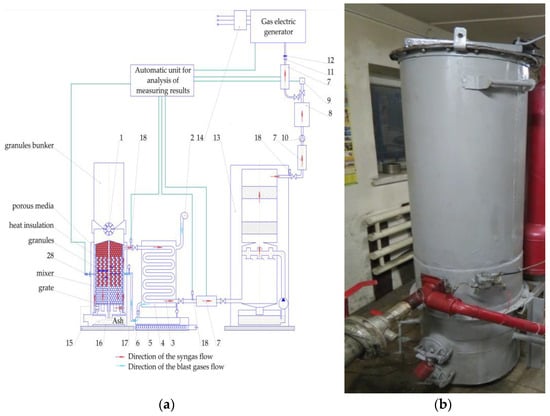 The experiments were held on a pilot plant equipped with a downdraft gasifier. The gasifier capacity was 60–68 m3/h. Gasifier [] was used as the basic design, but the chamber was changed to cylindrical type 350 × 200 × 208 mm (length, ID, and OD, respectively). The material of the gasification chamber was H25N20S2 steel. The block chart (a) and a general view (b) of a pilot gasifier plant are shown in Figure 1.