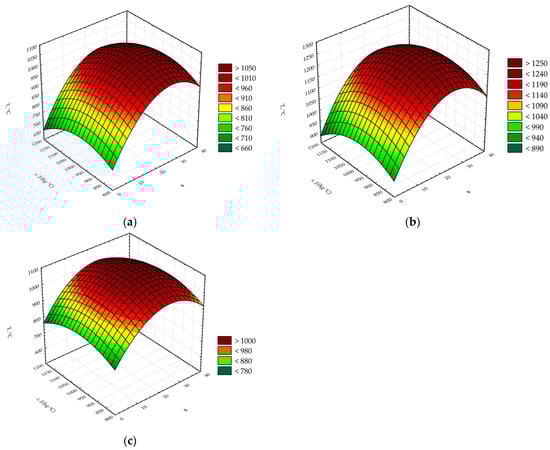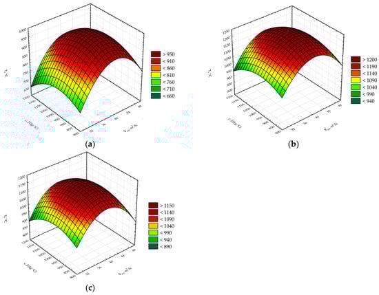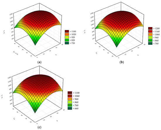 After processing the experimental data in Statistica, graphical dependencies for the optimisation criteria were constructed from the factor variation levels in the form of the second-order response surfaces. Graphical representations of the abovementioned equation are shown in Figure 2, Figure 3 and Figure 4.