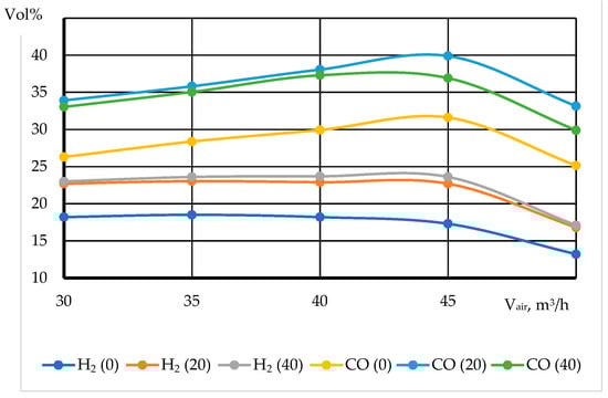 As expected, the concentration of H2 in the gas increased as the blowing rate increased (Figure 5). This occurred because there was more hydrogen available in the reactants due to the higher blowing rates. The growth in H2 concentration continued until the blowing rate reached 42–44 m3/h; beyond this point, the H2 content began to decrease. The rate of decrease in H2 concentration was lower than the rate of decrease in reaction zone temperature e (Figure 2, Figure 3 and Figure 4). The decrease in hydrogen concentration was attributed to the intensive evacuation of unreacted fuel from the reaction zone, together with its cooling due to excessive blowing.