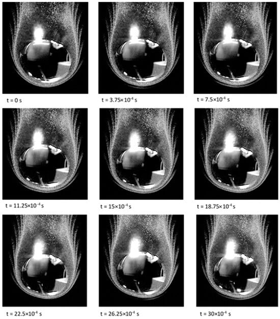 1. Cyclic nucleation on the downward-facing side of the drop, resulting in striped patterns of nucleated aerosol (Figure 1 and Figure 2). Nucleation starts in a thin layer at a certain distance away from the drop’s downward-facing surface, around the stagnation point, quickly expanding to the sides, creating a thin aerosol layer in the shape of a spherical cap. This cap moves closer to the drop surface and stretches laterally, following the flow in the vicinity of the stagnation point. Another layer of nucleation begins around the stagnation point. The process repeats cyclically, with multiple parallel layers of aerosol being formed on the downward-facing side of the drop (Figure 2).
