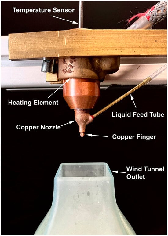 The free-falling drop suffers from some complications: (1) cooling of the liquid, (2) shape oscillations, and (3) droplet–air relative speed increasing with time. To simplify conditions, a suspended drop method was developed. A heated copper nozzle was exposed to upwards airflow from a small vertical open wind tunnel with a 32 mm × 32 mm square outlet (Figure 4) with the air at 20 °C. The copper nozzle had a copper finger protruding into the drop, which reduced the non-uniformity of the liquid temperature (Figure 5). The shape of the finger matched the contours of the droplet, leaving a liquid layer 0.2 to 0.6 mm thick. The nozzle base diameter was 4.1 mm. The windward tip of the suspended drop had a radius of 1.53 mm. The core of the nozzle was maintained within ±0.5 °C of the target temperature. Air speed was measured using a hot wire anemometer (Kimo VT-100, Kimo Electronics, Mumbai, India, measurement position same as nozzle). Using the base diameter as the length scale with air speeds of up to 1.85 m/s gives Reynolds numbers up to 505.