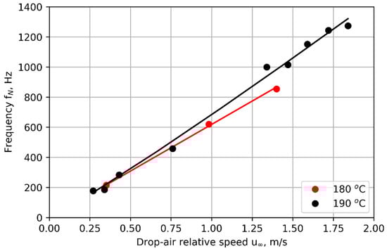 Of the liquids tested, cyclic nucleation was most stable for 1,3-propanediol. Where stable, the frequency of the cyclic appearance and cessation cycle, , was measured via analysis of the high-speed video sequences for 1,3-propanediol with nozzle temperatures of 180 and 190 °C. was weakly dependent on nozzle temperature and strongly dependent on the drop–air relative speed (Figure 7). A power law of fitted well with A = 619 and B = 1.002 for 180 °C (R2 = 0.999) and A = 684 and B = 1.08 for 190 °C (R2 = 0.987) (the fit uses in Hz and in m/s).