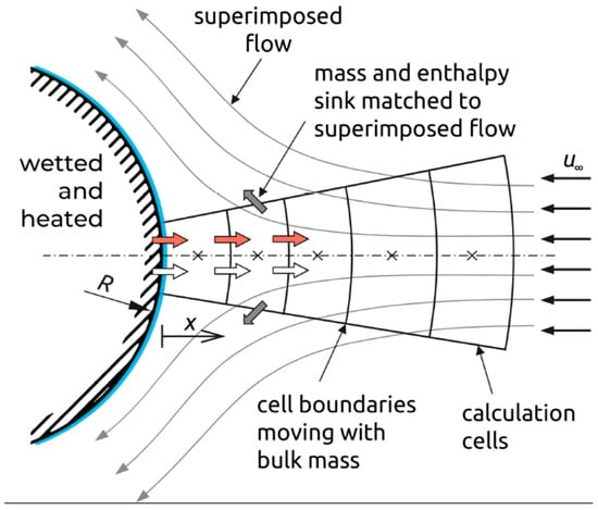 A simple finite volume model of cyclic nucleation was constructed using axis-symmetric potential flow solutions for the velocity field of the suspended drop. The coordinate system is spherical for the approaching flow, with the origin at the centre of curvature of the body’s windward face. Only the flow along the stagnation line is modelled, as this sets the nucleation frequency. Nucleation, growth, and heat transfer to the aerosol droplets were solved using a finite volume approach. Nucleation rate, droplet growth, and droplet-vapour heat transfer are computed in each cell. The computational cells move with the bulk mass (Figure 8). Thus, no convectional transport across the boundaries needs to be calculated, only diffusion. As the cell boundary at the surface is the only one not moving with bulk mass, the transfer of heat and the volatile compound’s mass is calculated according to unimolar transfer from the surface to the first cell’s centre. It is assumed that heat and mass transport within the boundary layer are dominant in the one coordinate which is used for discretization. Cells are split or merged to keep their size within 0.4 to 1.5 times their initial width. Splitting occurs in the cell closest to the evaporating surface as it constantly gains mass. Merging occurs in the approaching flow simulation due to the mass and enthalpy sinks, which are used to generate the flow pattern.