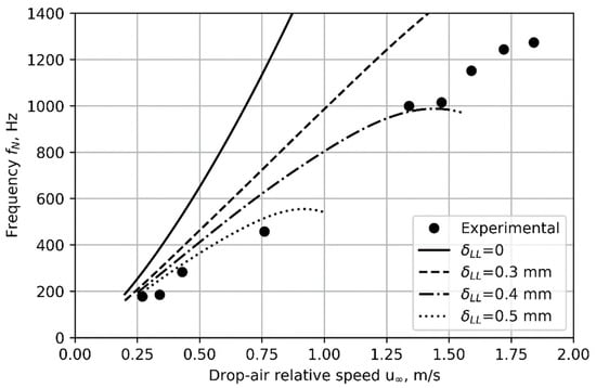 Figure 11 compares the frequency of cyclic nucleation predicted by the CFD model to experimental results with a nozzle core temperature of 190 °C. The trend observed in the experiment of nucleation frequency increasing with drop–air relative velocity is successfully reproduced by the model. A power law (Equation (20)) fits the CFD predictions well, albeit with coefficients differing from the fit to experimental data (A = 975, B = 1.24 for the CFD with f in Hz and u in m/s).