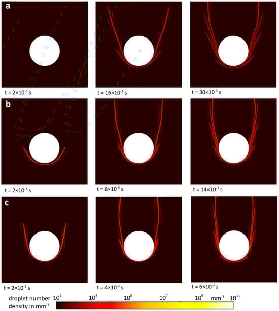 Plots of droplet number density (log scale) at various times from a parent drop with surface temperature of 180 °C. Droplet-air relative velocities: (a) 0.2 m/s, (b) 0.4 m/s, and (c) 0.8 m/s.