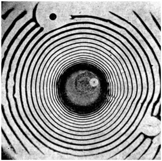 A similar, perhaps analogous, phenomenon is the Liesegang ring effect [,,,,], where chemical reaction and precipitation take the place of nucleation and condensation. A chemical is removed from the fluid by a reaction with a solid phase product (precipitation). Reagents diffuse to the site of the precipitation, depleting nearby regions and suppressing precipitation in these regions. This causes rings of precipitate to form, with precipitate-free regions between them. An example of these Liesegang patterns is shown in Figure 12 ([], taken from Liesegang’s original []). An explanation of these rings, in terms of supersaturation, was offered by Ostwald [], quantified by Prager [] and Zeldovich et al. [], and later extended by Smith []. Alternative explanations have also been offered as reviewed by Stern [].