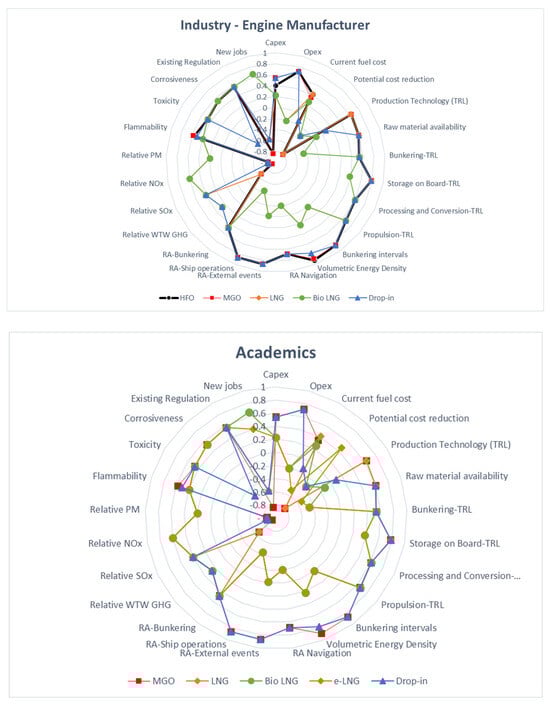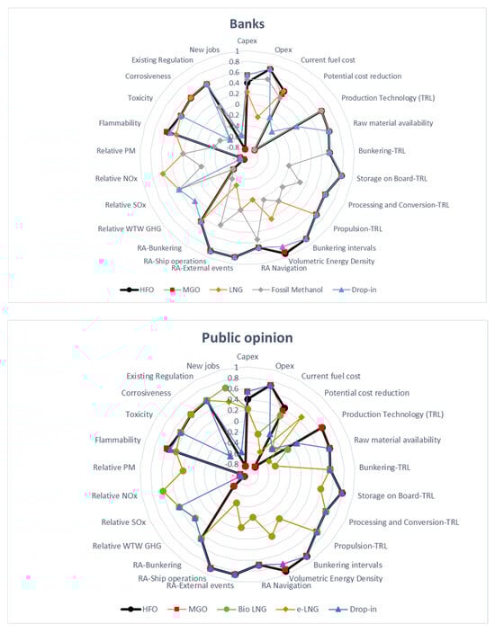 Figure 3 shows the impact of each criterion in the classification process for the five highest-ranked fuel options for all stakeholder groups, separately. In the shipowners’ graph, the lines of MGO and HFO almost overlap, and their highest performance occurred mainly due to their high performance in technical indicators, while Bio-LNG is distinguished for its values in environmental indicators. A similar influence is observed in the fuel suppliers’ group and industry-engine manufacturers’ group, who prioritized existing regulation, fuel cost, availability and emissions’ reductions. On the contrary, the environmental indicators had a key role for the classification of academics and the public. Fossil methanol is the new entry in the banks group because of the relatively good performance in risk assessment, fuel availability and emission reductions.
