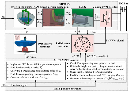 Figure 1 illustrates the structure diagram of a NIPWEC and the wave power controller with a MLTB MPPT algorithm. Herein, the characteristic period means the wave period which is derived from the wave energy spectrum, such as the energy period or the peak period . The NIPWEC consists of an inverse pendulum, a speed-increase mechanism, a PMSG, a MPAM, and a three-phase PWM rectifier. At first, the inverse pendulum is uninterruptedly driven by the wave excitation moment . Next, the speed-increase mechanism accelerates the swing process and transmits the kinetic energy from the inverse-pendulum to a PMSG. At last, the PMSG absorbs the above kinetic energy and generates electricity for a direct current (DC) bus.