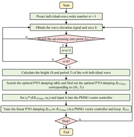 Furthermore, the wave power controller contains a MLTB MPPT processer, a PMSM servo controller, and a PMSG vector controller. The working principle of a wave power controller is as follows. Firstly, wave elevation signals (WESs) are collected and inputted into a MLTB MPPT processer. Next, the MLTB MPPT processer queries a 1-D resonance position table or a 2-D optimal PTO damping table and identifies the corresponding resonance position or the optimal PTO damping , according to the results from the spectral analysis and statistical analysis of WESs. Then, the PMSM servo controller ensures MPAM trails the reference position . Meanwhile, the PMSG vector controller carries out 0 d-axis current () control and changes the q-axis current to track the reference q-axis current . Herein, signifies the angular velocity of the PMSG rotor. Finally, NIPWEC is controlled to ensure it fully absorbs wave power in the resonant state. Detailed description of the MLTB MPPT processor can be seen in Section 2.2. More information on the PMSG vector controller or the PMSM servo controller is displayed in Section 2.3.