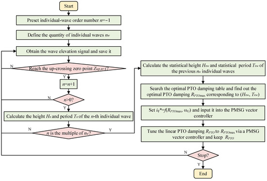 MLTB MPPT processor owns two modules. The first one is a generating module for the lookup-table-based (LTB) PTO damping tuning. Control flow of this module can be seen in Figure 2 and Figure 3. The generating module is divided into two parts depending on whether the quantity of individual waves > 1. If yes, a time-domain statistic will be calculated for both the height and period of the previous individual waves, for the sake of the query. Otherwise, the height and period of the previous (-th) individual wave will be directly utilized to query . Herein, is generated according to the following equation: