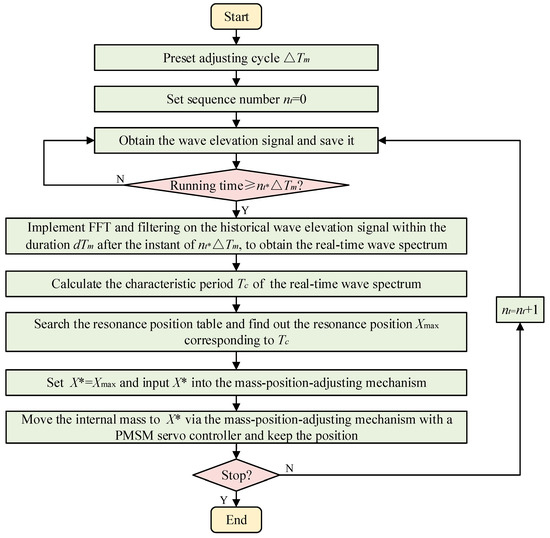 The second module is named an generating module for the LTB IPA. The control flow of this module can be seen in Figure 4. First, implement a fast Fourier transformation (FFT) for the WES to get a wave spectrum. Next, find the characteristic period of the wave spectrum. Then, query the 1-D resonance position table based on and determine the corresponding . Finally, generate and implement PMSM servo control. According to Ref. [32], energy period resonance delivers a good power absorption performance and possesses high reliability. Hence, we take the energy period , i.e., the ratio between the moments of order −1 and 0 of a wave spectrum, as the here.