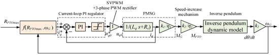 (1) Mathematical models of the PMSG vector control and permanent magnet synchronous motor (PMSM) servo control are established for the MLTB MPPT. The models contain the efficiency values of the key links of the PTO damping tuning and internal mass position adjustment. Hence, they can be utilized to simulate the changing control signals, the controlled dynamic process of the inverse pendulum, PTO and mass-position-adjusting mechanism (MPAM), as well as the power transmission/loss/consumption at each link.