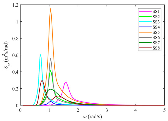 Parameters of the investigated eight irregular sea states (SSs) are listed in Table 3. Herein, the researched significant wave heights and energy periods of all SSs are common at the P6 position in the offshore area of the East China Sea [36]. The wave spectra of the eight SSs are illustrated in Figure 7.