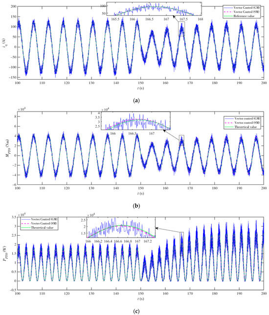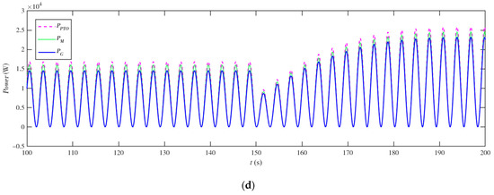 The PMSG vector controller for PTO damping tuning was based on the 0 d-axis current control. It only contained a current loop proportional–integral (PI) regulator. The general model (GM) of the PMSG vector control can be seen in Refs. [14,33]. However, GM is complicated and adverse to fast solving since sub-models of the space vector PWM (SVPWM) and rectifier thyristors are comprehensively included in this model. This disadvantage is especially evident for the simulations of a long timescale, such as the kilo-second timescale simulations for changing sea states. Therefore, it is necessary to propose a simplified model (SM) of the PMSG vector control in order to reduce the computational burden. Sjolte at al. [34] regarded PWM and converter as a unity gain for the preliminary discussion of PMSG vector control. Herein, we present an SM which adopts the same simplification and assumes that the reference d-axis current = 0 has been well tracked. This means that the control can be decoupled from the control, eliminating the time-consuming power electronic simulations. Although the SM idealizes the power electronic control and cannot simulate the high-frequency components caused by chopping, it can effectively emulate the long-term trends of key variables, e.g., , the PTO moment , and the absorbed power . This is enough for our research. In order to further validate the simplification feasibility, the performance comparison between the GM and the proposed SM is discussed in Section 4.1.