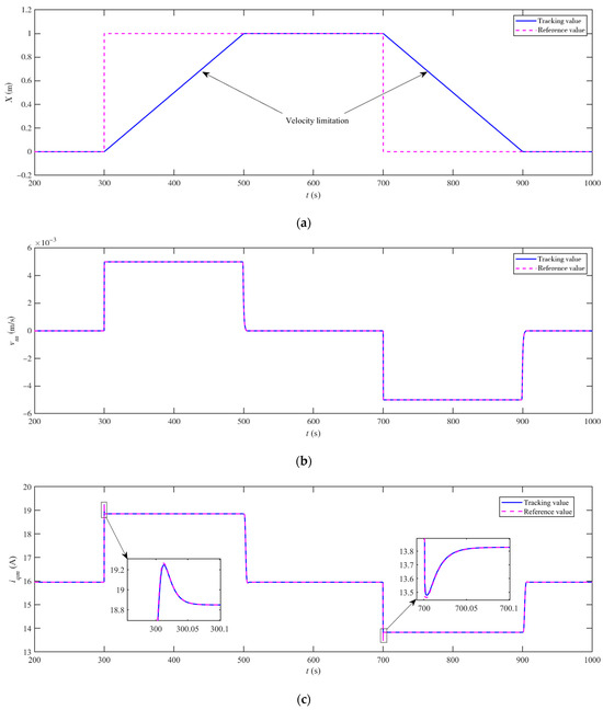 The PMSM servo controller was designed on the basis of the PMSM vector control, whose structure is similar to that of the aforementioned PMSG vector control. Additionally, this PMSM servo controller contains three regulators from the outside to the inside. Firstly, the outermost layer is a position loop proportional (P) regulator which generates a velocity control signal, i.e., the reference internal mass velocity , according to the error between and the measured . According to Ref. [8], proportional control is enough for position tracking. Secondly, the middle layer is a velocity loop PI regulator which produces a current control signal, i.e., the reference PMSM q-axis current , based on the error between and the measured internal mass velocity . Thirdly, the innermost layer is the current loop PI regulator based on the 0 d-axis current control. This current loop PI regulator as well as the SVPWM-based three-phase inverter can also be simplified by the SM proposed in Section 2.3.1, in order to reduce the computational burden.