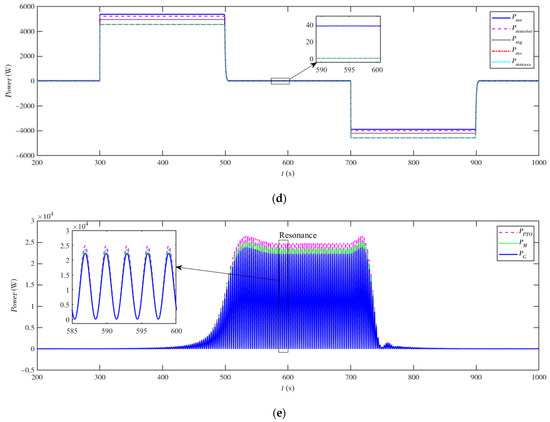 Firstly, the feasibility of the PMSG vector control and the PMSM servo control was validated via the time-domain simulations under the regular wave with a wave period of 6 s and a 0.5 m wave height. For the validation of the PMSG vector control for PTO damping tuning, the PTO damping was set to 1 × 105 Nms before 150 s and then tuned to 4.9 × 105 Nms at 150 s (simulation duration: 300 s). Meanwhile, the internal mass position was set to 1 m to ensure resonance. In terms of the PMSM servo control for internal mass adjustment, was altered from 0 m to 1 m, i.e., the resonance position, after 300 s, and then altered from 1 m to 0 m after 700 s (simulation duration: 1000 s). Meanwhile, the was fixed at 4.9 × 105 Nms.
