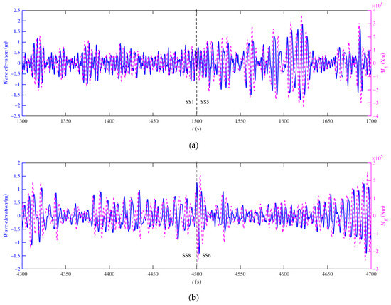 Parameter settings for the simulated sea states. Herein, , , and ( = 1, 2) indicate the significant wave height, peak period, and shape parameter of the low/high frequency section for an Ochi–Hubble spectrum, respectively. represents the peak period. refers to the peak enhancement factor, which is positively correlated with the slenderness of a spectrum peak.