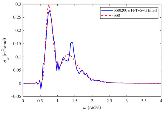 Wave spectrum computation results for the SS8 WES within 0–200 s. Herein, indicates the wave spectrum density, while indicates the wave angular frequency. The polynomial order and frame length of an S–G filter are 5 and 15, respectively. Root-mean-square error between the results computed by “200 s FFT+S–G filter” and the theoretical data is 0.01. Meanwhile, the coefficient of determination is 0.96.