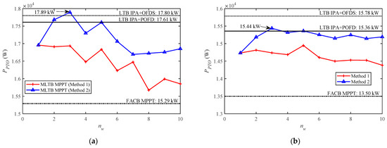 Results show that both the MLTB MPPT (Method 2) and the LTB IPA+OFDS can obtain the basically equivalent to LTB IPA+POFD. However, of the FACB MPPT can only reach 87–88% of that of the POFD. MLTB MPPT (Method 2) is able to get more than the LTB IPA+OFDS (see the blue point against = 3, Figure 12a). In addition, values of the MLTB MPPT (Method 1) are all equal to or less than those of the MLTB MPPT (Method 2). This means that the query based on is better than that based on . Furthermore, both the MLTB MPPT (Method 2) and MLTB MPPT (Method 1) are better than the FACB MPPT.