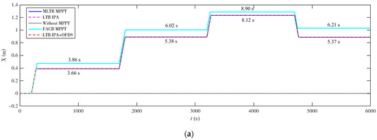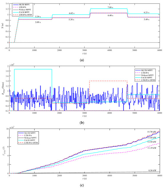 Comparison of the three MPPT algorithms in terms of the maximum absorbed power () tracking are illustrated by Figure 12. All MPPT algorithms are implemented based on the FFT for the 200 s WES after each sea state variation. For example, LTB IPA of the MLTB MPPT starts at 200 s, 1700 s, 3200 s, and 4700 s to make sure that the FFT of a 200 s WES for each sea state has already been conducted. Moreover, the simulation results against the LTB IPA combined with the prior optimal fixed damping (POFD) are also given.