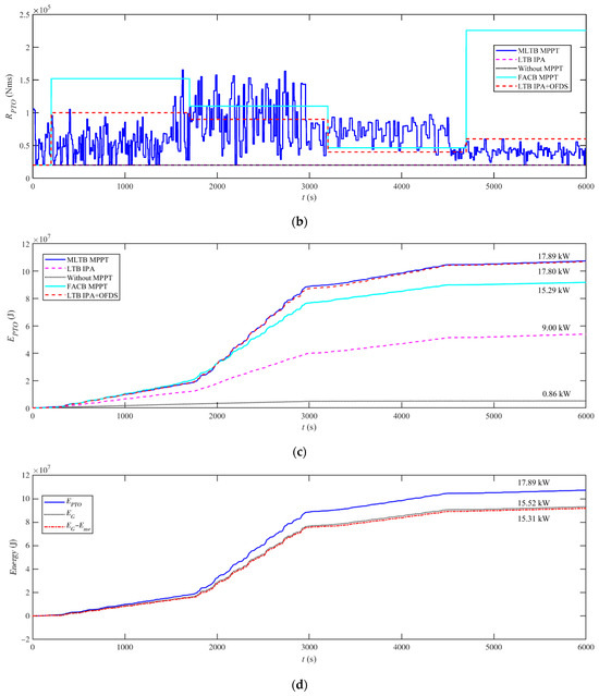 (2) Three MPPT algorithms tunes the PTO damping according to the “optimal” PTO damping, independently discovered by themselves. However, curves of different MPPT algorithms are quite distinct (see Figure 13b and Figure 14b). In addition, although the MLTB MPPT and LTB IPA+OFDS have a similar tracking performance, it is difficult to find a correlation between their curves. Hence, it can be observed that the “optimal” PTO damping of the two MPPT algorithms with the similar tracking performance may be significantly different from one another.