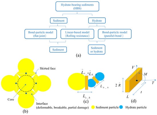 The details of the DEM algorithm can be found in Ref. [51]. Only the simulation methodology of HBS is presented here. HBS can be regarded as a composite medium composed of sediment particles and hydrate particles (Figure 1a). Thus, there are three contact types in HBS, namely sediment–sediment (s_s), sediment–hydrate (s_h), and hydrate–hydrate (h_h). In s_s, the bond force is as weak as the capillary tension of meniscus water [52]; thus, the flat-joint model is adopted (Figure 1b) in which the circular particles are constructed into polygonal particles and a flat-joint contact simulates the behavior of an interface between two notional surfaces. In s_h and h_h, the bonds are stronger due to the cemented nature of hydrates [53]. Consequently, the parallel-bond model is used to characterize the mechanical behavior of hydrates (Figure 1c) [54,55]. Once the bonds fail, they degenerate into the rolling resistance model, in which a rolling resistance coefficient is used to characterize the shape effect of particles (Figure 1d).