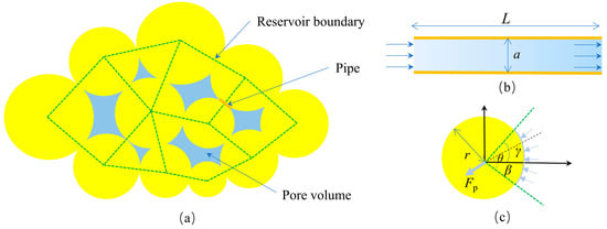 The coupling between fluid and mechanical fields is described using Cundall’s fluid flow algorithm [56,57,58]. In Cundall’s fluid flow algorithm, a closed chain formed by particles in contact with each other is defined as a “reservoir” for storing pore fluid, and each contact is assumed to be a “pipe” for exchanging fluid from adjacent reservoirs, resulting in the formation of a flow network, as shown in Figure 2a.