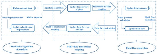 The fully coupled fluid–mechanical models are shown in Figure 3. The simulation of the mechanics of particles is presented on the left side, where the movement of particles and the contact force between particles are updated by the motion equation and force-displacement law; the simulation of fluid flow is presented on the right side, where Cundall’s fluid flow algorithm is employed; and in the middle is the fluid–mechanical coupling process, where the variation in contact force between particles causes the change in pipe aperture, and the variation in reservoir pressure updates its force on the surrounding particles. After the fluid calculation step, a kind of additional force is exerted on the particles calculated by fluid pressure in the reservoir. Consequently, the above two interactive processes realized the full coupling of the mechanical and fluid fields.