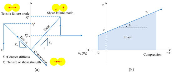 Figure 4 shows the bond failure modes and the failure envelope. When the tensile stress or shear stress exceeds the tensile strength or shear strength , a corresponding tensile or shear microcrack occurs. The shear strength is determined by the normal stress , cohesion , and friction angle and described as