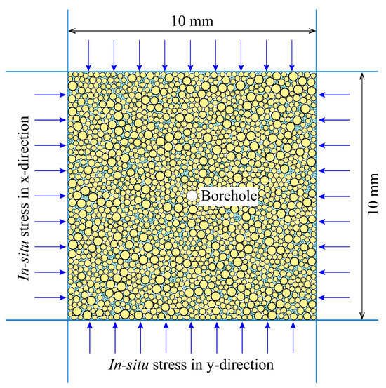 Figure 5 shows the HF model of HBS. The radius of sediment particles is 0.1–0.2 mm, and the median size is 0.113 mm, which is consistent with that of sediments in the Nankai Trough [61]. Referring to the method used in previous studies, smaller particles (0.04 mm radius) are generated to represent hydrates [15,54,55]. In this manner, HBS with a certain hydrate saturation can be generated by controlling the number of hydrate particles. The densities of sediments and hydrates are the same as those in the Nankai Trough, at 2650 and 320 kg/m3, respectively [61]. Limited by computing resources, the model size is set to 10 mm × 10 mm. A circular hole with a radius of 0.3 mm is reserved in the center of the model for fluid injection. Additionally, the surrounding smooth servo walls are used for simulating the in situ stress through the servo mechanism [51].
