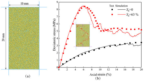 Proper calibration of meso-parameters is crucial for DEM simulation. Here, drained shearing tests are mostly used to calibrate meso-parameters, and the calibration principle is that the mechanical response of HBS generated by the DEM is qualitatively consistent with the indoor test results. Based on the drained shearing test results of HBS in the Nankai Trough [62], the “trial–error” method was adopted to calibrate the meso-parameters. Through repeated attempts, the values of the meso-parameters were obtained (Table 1). The drained shear model of HBS is shown in Figure 6. It can be seen that the simulated deviatoric stress–axial strain is in good agreement with the indoor test results, proving the reliability of the values of the meso-parameters in Table 1.