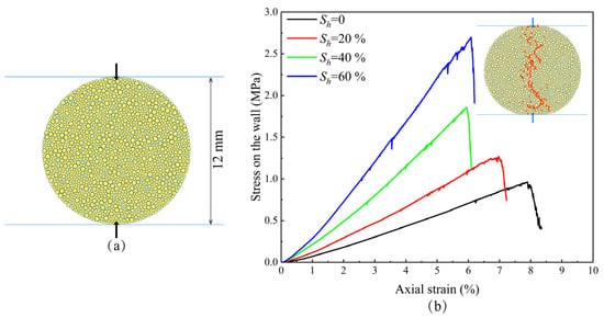 Additionally, the Brazilian splitting test was simulated to obtain the tensile strength of HBS, as shown in Figure 7. When the hydrate saturation is 0%, 20%, 40%, and 60%, the simulated tensile strength of HBS is 0.59, 0.80, 1.17, and 1.71 MPa respectively, indicating that the tensile strength increases as hydrate saturation increases.