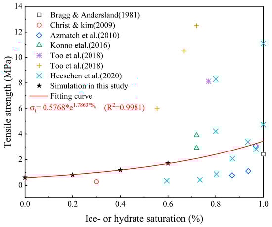 Figure 8 depicts the obtained in our simulation and previous indoor tests. It can be seen that the tensile strength obtained from previous indoor tests is highly variable. This is due to the strong non-homogeneity of HBS, especially since sediment components, grain size, and hydrate distribution pattern all have significant influence on the mechanic properties of HBS. Nevertheless, a general trend of increasing tensile strength with increasing hydrate saturation can be observed as the existence of hydrates improves the consolidation of HBS. The simulated values are within the range of the test results of 0.28−12.5 MPa [26,27,63,64,65,66,67], which further supports the reliability of the DEM model. Additionally, the simulated tensile strength also increases as hydrate saturation increases and is found to be an exponential function of hydrate saturation with a fitting coefficient R2 of 0.9981. This indicates that the DEM model well simulated the bonding characteristics of hydrate particles.