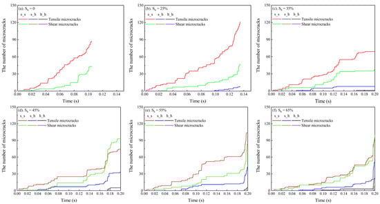 To reveal the fracture evolution mechanism, the microcracks with different failure modes generated at different contacts were recorded, as shown in Figure 13. As can be seen, both tensile and shear microcracks exist at s_s for the hydrate-free sediment (Figure 13a), with more tensile microcracks. When the hydrate saturation is 25% (Figure 13b), a few tensile microcracks occur at s_h. When the hydrate saturation increases to 35% (Figure 13c–f), there is further emergence of a few tensile microcracks at h_h, whereas shear microcracks are difficult to occur at s_h and h_h. Overall, tensile and shear microcracks at s_s play a dominant role, followed by the tensile microcracks at s_h.