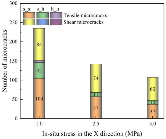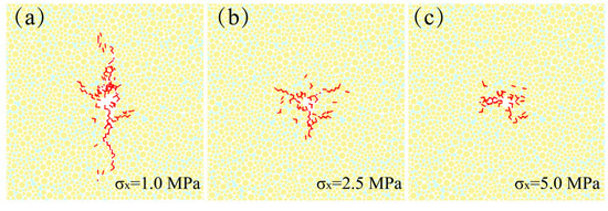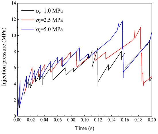 The injection pressure under different in situ stress conditions is shown in Figure 14. As can be seen, when the in situ stresses in the X-direction were 1, 2.5, and 5 MPa, the breakdown pressures were 8.82, 11.02, and 11.82 MPa, respectively, indicating that the breakdown pressure increases as the in situ stress increases. This is because great contact force needs to be overcome for the generation of microcracks under high in situ stress.