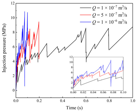 The injection pressure at various injection rates is shown in Figure 17. With the increase in the injection rate, the fluctuation frequency of injection pressure increased, indicating that more microcracks were generated. Additionally, the breakdown pressures are 8.76, 9.45, and 10.86 MPa for injection rates of 1 × 10−7, 5 × 10−7, and 1 × 10−6 m3/s, respectively, indicating that the breakdown pressure increases as the injection rate increases. The HF experiments of HBS in Ref. [30] also observed this phenomenon, and the mechanism for this is the rapid accumulation and hysteresis dissipation of bottom-hole fluid energy at a high injection rate.