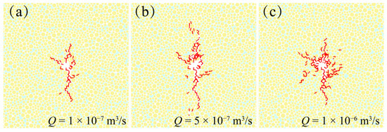 Microcrack distribution under various injection rates. (a) Q = 1 × 10−7 m3/s; (b) 5 × 10−7 m3/s; (c) 1 × 10−6 m3/s.