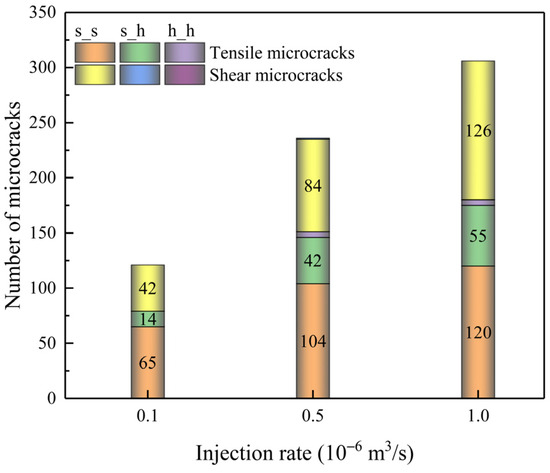 The microcrack distribution as well as the number of microcracks under different injection rates are shown in Figure 18 and Figure 19, respectively. As can be seen, when the injection rate is enhanced from 1 × 10−7 m3/s to 1 × 10−6 m3/s, the number of microcracks increases from 121 to 306, suggesting that microcrack generation is more favorable at large injection rates. However, when the injection rate is 1 × 10−6 m3/s, microcracks are mainly distributed in the near-well region, resulting in insufficient fracture penetration depth. Overall, when the displacement is 5 × 10−7 m3/s, the number of microcracks is sufficient and the fracture penetration depth is ideal. Therefore, appropriate injection rates should be selected when designing the fracturing plans for hydrate reservoirs.