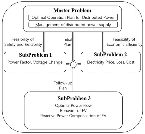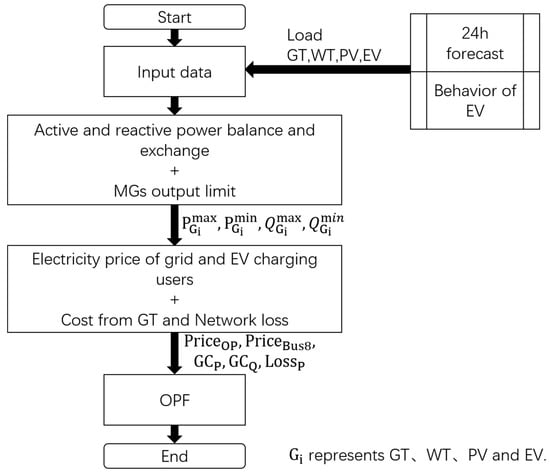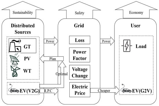 The proposed approach depicted in Figure 3 applied the problems of active and reactive power management. Firstly, management conformed to safety, reliability, and economic efficiency considering power cost from GT, and distributed power exchange from PV, WT, and EV in the V2G model. After receiving the initial plan from power flow calculation, the economic objective was considered to improve the optimal power flow results. The initial plan and follow-up plan were linked through a programming model to minimize the grid cost and EV user charging cost.