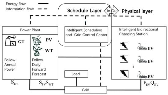 In Figure 1 and Figure 2, the intelligent scheduling and grid control center receives information from each component and feeds back the results after calculating and processing, including power factor and voltage change for ensuring power quality, 24 h electricity price for trading electricity, and energy scheduling from distributed renewable resources. Also, EV charging electricity price, which is associated closely with EV behavior, is an important key to proving the feasibility of economic efficiency. After the electric vehicle enters the intelligent bidirectional charging station, the station provides the state of charge (SOC) and driving plan to the grid. The center feeds back the EV reactive power scheduling scheme and EV charging price according to its information. In terms of power plants, a gas turbine (GT) is responsible for most active power generation tasks and needs to generate power according to the annual load plan. Wind turbines (WT) and photovoltaic power generation (PV) are new renewable power sources, and the power generation is predictable.