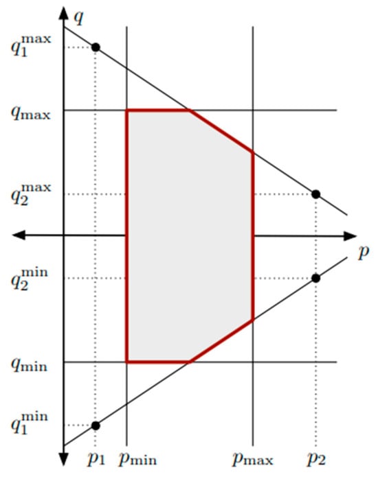 In addition to the constraints mentioned in Section 2, the distributed generation within the microgrid must also adhere to Box Constraints for both the active and reactive power injections into the system. The actual P-Q curve, illustrating the relationship between active and reactive power, is depicted in Figure 5. The shaded portion in the figure represents the feasible operating region for the unit.