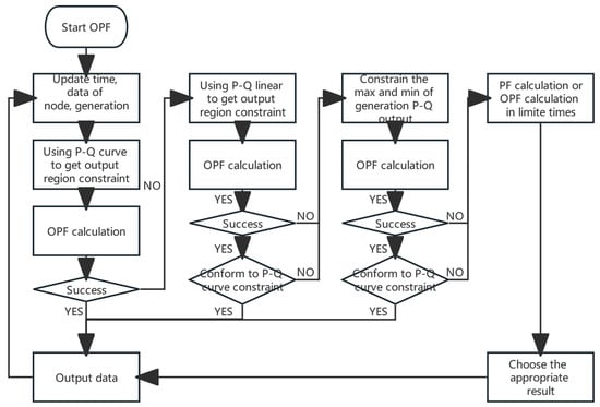 By incorporating the variable into the MatPower7.1 program, linear boundary constraints for active and reactive power injections with a slope of ±1 were established according to the dots trajectory. This approach enabled the definition of a more realistic and scientifically grounded power generation area for generators, which is surrounded by red line. However, it should be noted that these area constraints might occasionally conflict with the constraints imposed by the active and reactive power curve, as expressed in Formula (7) for distributed power supply in Section 2. The process of OPF is shown in Figure 6. When conducting the optimal power flow (OPF), excessively strict constraints often result in non-convergence of the results. In Figure 6, the OPF was performed considering the most stringent P-Q non-linear Box constraints first, followed by the consideration of P-Q linear Box constraints. If the results still did not converge, the constraint of power limits was considered without the Box constraints. In the case of non-convergence, the calculation results were determined based on the limited number of iterations.