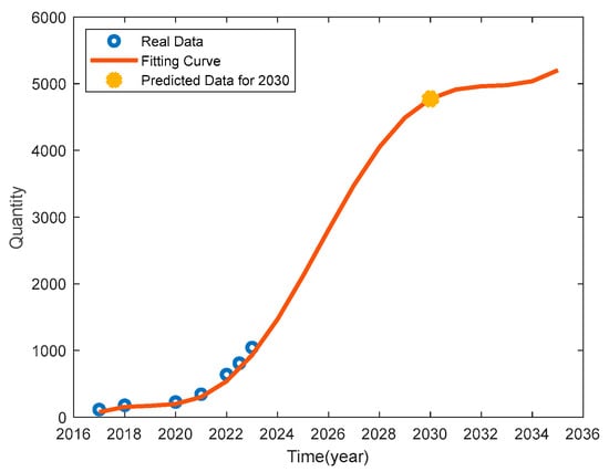 The number of EVs can be predicted by statistics from the Ministry of Public Security of the People‘s Republic of China from 2017 to 2023. The quantity of the EV-Year curve, shown in Figure 7, is obtained according to the fitting function :