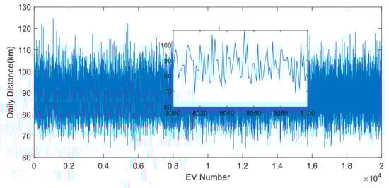 Daily driving distance of 16,789 EVs (The subgraph shows EV No.8000 through No.8100).