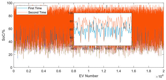 According to Table 1, after Monte Carlo planning of 16,789 EVs, Figure 8, Figure 9 and Figure 10 are obtained. According to the calculation formula in Section 2.4, EV charging time and Soc are obtained in Figure 9 and Figure 11.