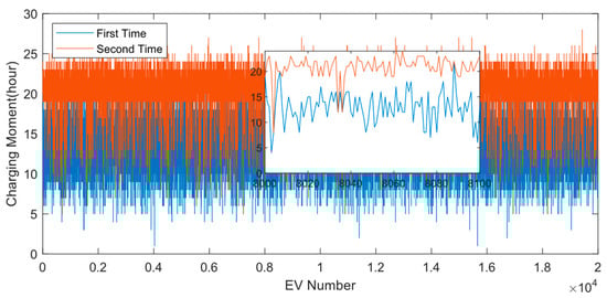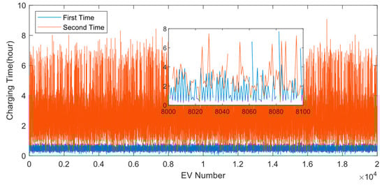 Every EV’s charging moment (The subgraph shows EV No.8000 through No.8100). The addition of the first and second values is equal, indicating that the EV is only charged once.