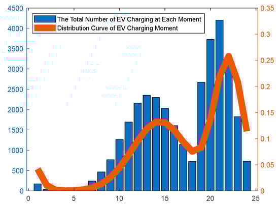 Figure 12 is obtained by counting the number of incoming EVs per moment in Figure 10 and comparing it with the probability distribution function of two charges. For the two-charge model proposed in this paper, firstly, the single-charge distribution is split based on time. Then, by extending the time scale (from 24 h to 48 h) and recombining (reintegrated to a 24 h scale), the probability distribution of EV charging twice per day is calculated. Sampling for single charging was performed for two time periods, and it was observed that the trend roughly conformed to the calculated probability distribution, as shown in Figure 12. Therefore, the two-charge time model is also accurate. According to the experiment, when the number of EVs increases, the daily EV charging quantity tends to be closer to the distribution function, which accords with the Monte Carlo principle and large number theorem.