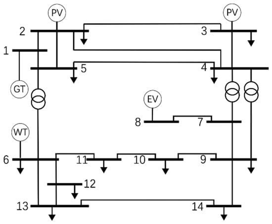 An improved IEEE14 node network system is depicted in Figure 13. The system consisted of various components, including GT connected to bus 1, PV connected to bus 2 and bus 3, WT connected to bus 6, EV connected to bus 8, and electric loads connected to the remaining buses in the test case of medium and low voltage microgrid. Low base voltages and ample voltage control capabilities, featuring 14 buses, 20 branches, 3 transformer device branches, and 5 generators, characterized the system. It is important to note that, in order to accurately represent the impact of distributed generation on the microgrid, the power generation capacity of the sources had been adjusted using daily data.