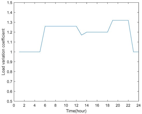 The branch data is reported in Table 2, while the load input data is reported in Table 3 [26]. The loads were assumed to vary throughout the day based on a stepped profile, which was derived from data collected in a region in southeast China, as depicted in Figure 14. Additionally, in Table 3, the symbol “x” on bus 8 indicates that the active and reactive power demand changes depending on the behavior of EV.