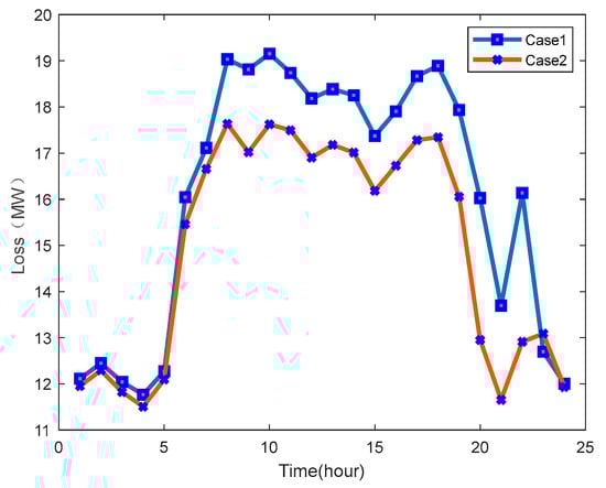 The analysis of Figure 15 revealed that in Case 2, the overall system network loss decreased, leading to a 7.07% reduction in the daily average system network loss. The largest decrease in system network loss occurred at 22:00, with a significant reduction of 20.35%.